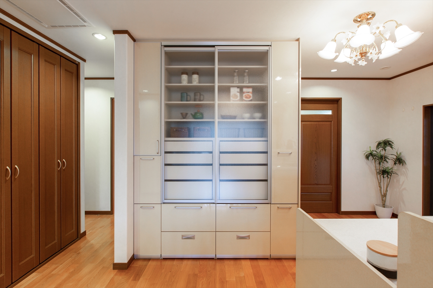 更に、キッチンがすっきりと片付く食料品の備蓄もできる大型パントリーで収納が楽に。