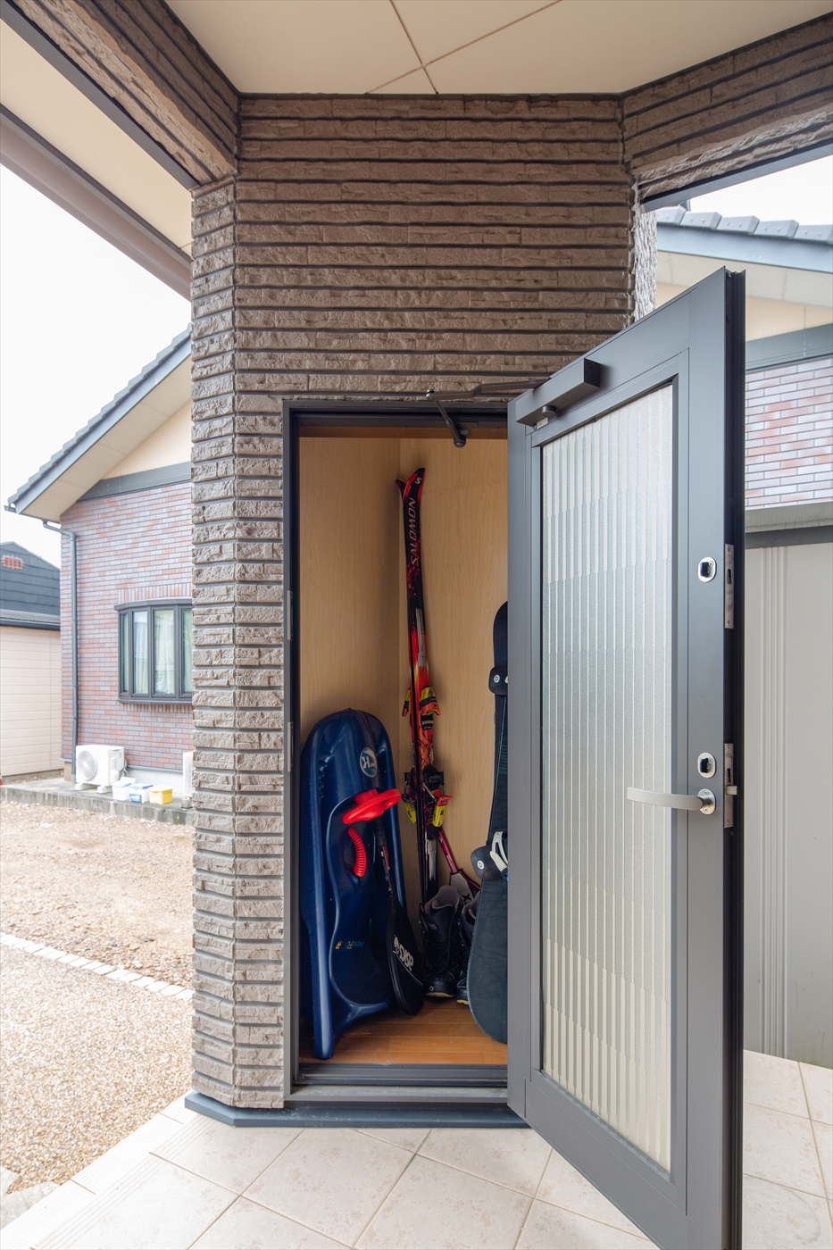 季節物や室内ではニオイが気になる灯油缶などが収納できる外部収納。