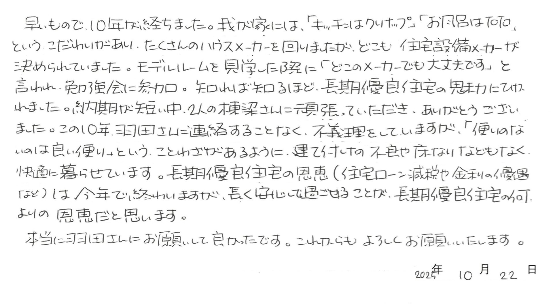 羽田建設さんからは、今後のアフターサービスについて資料をいただきましたので、安心して暮らしていけます。10年経過し快適に過ごせることに感謝しております。ありがとうございます。