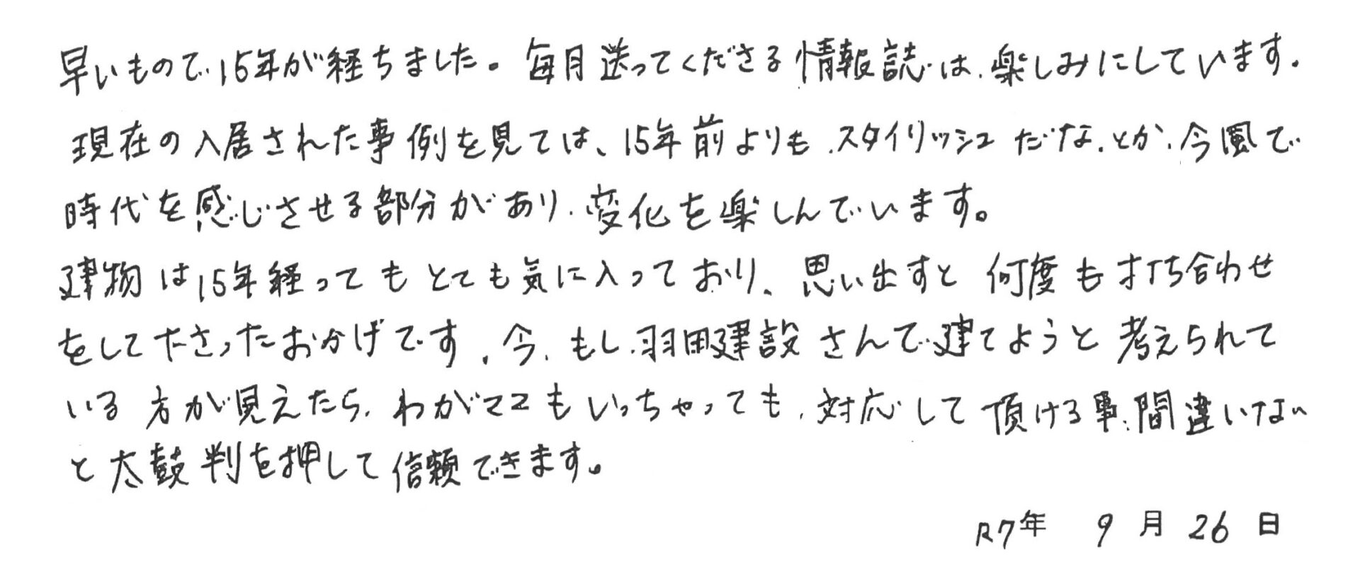 建物は15年経ってもとても気に入っており、思い出すと何度も打合わせをして下さったおかげです。今、もし、羽田建さんで建てようと考えられている方が見えたら、わがママもいっちゃっても、対応して頂ける事、間違いないと太鼓判を押して信頼できます。