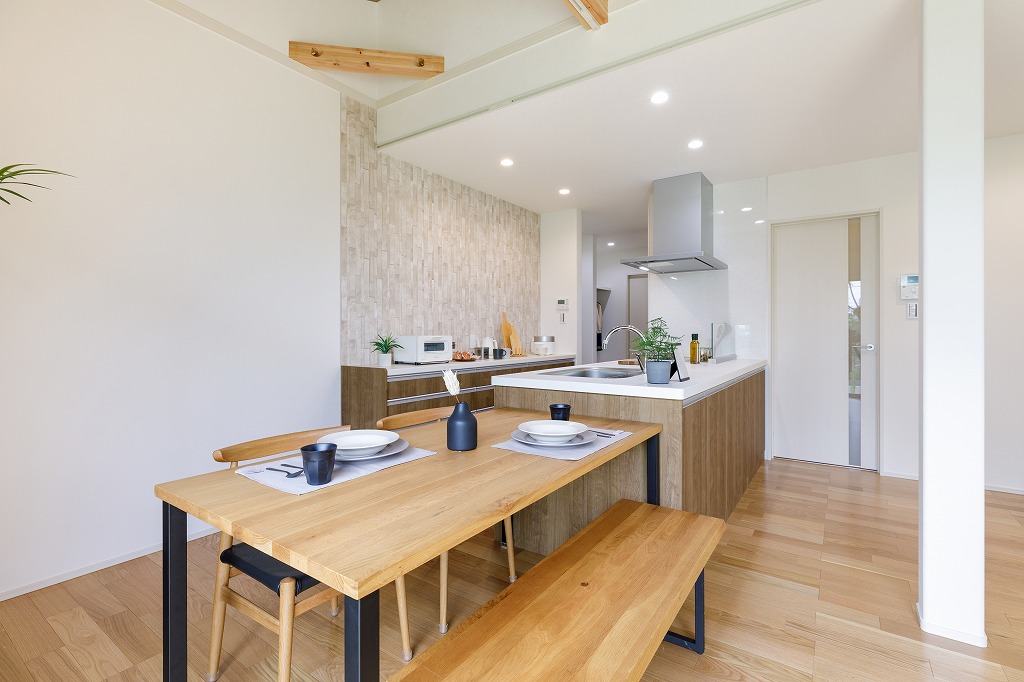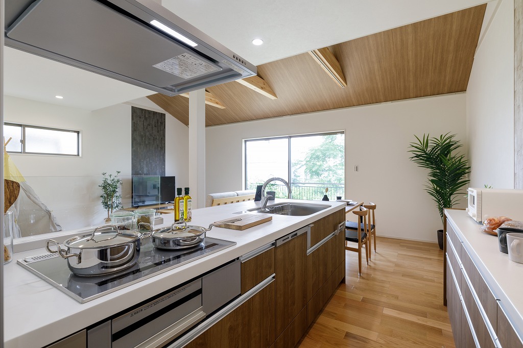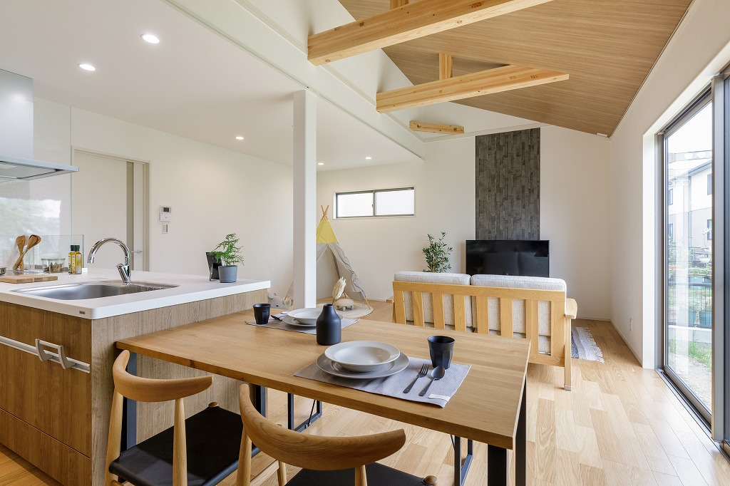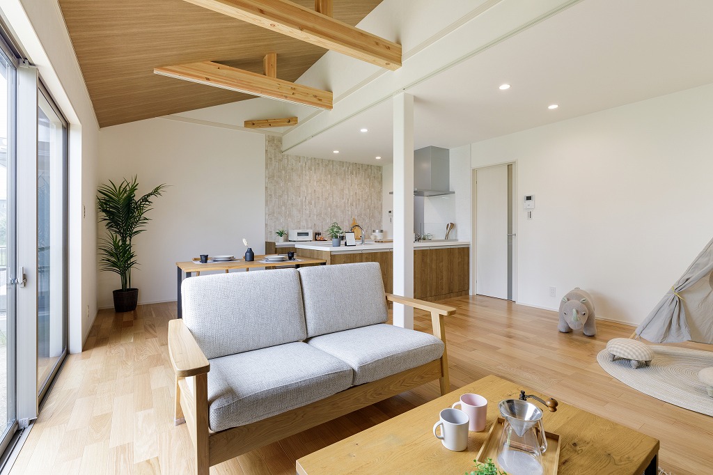 見上げれば、視線をどこまでも誘うダイナミックな勾配天井のLDKが広がります。