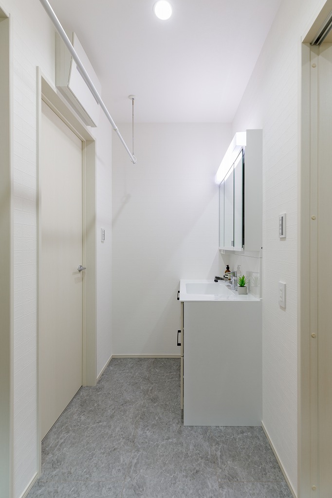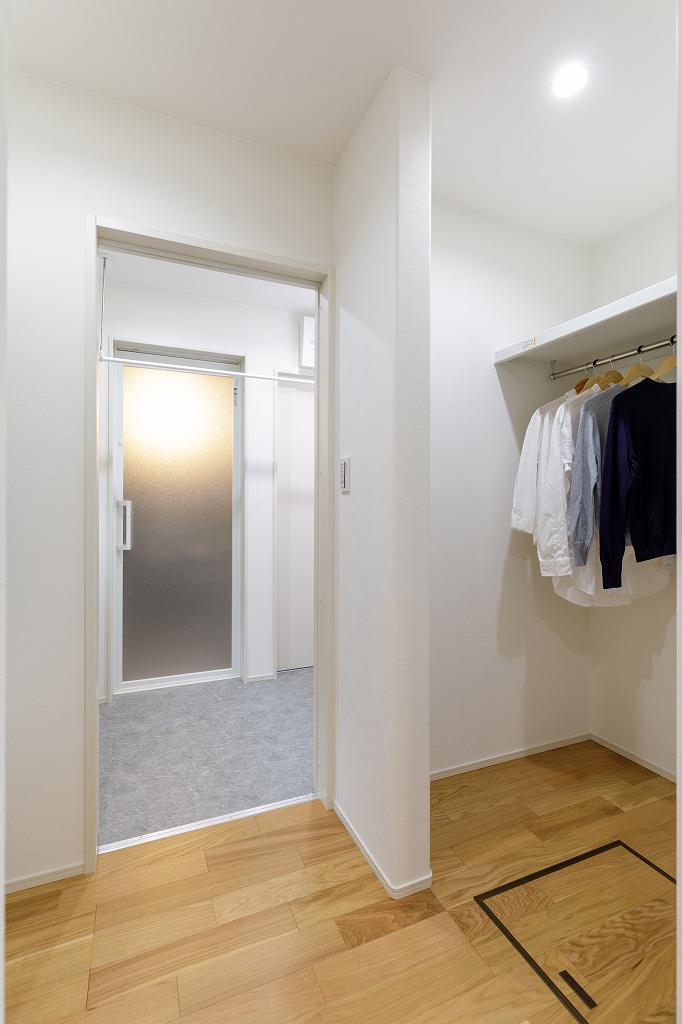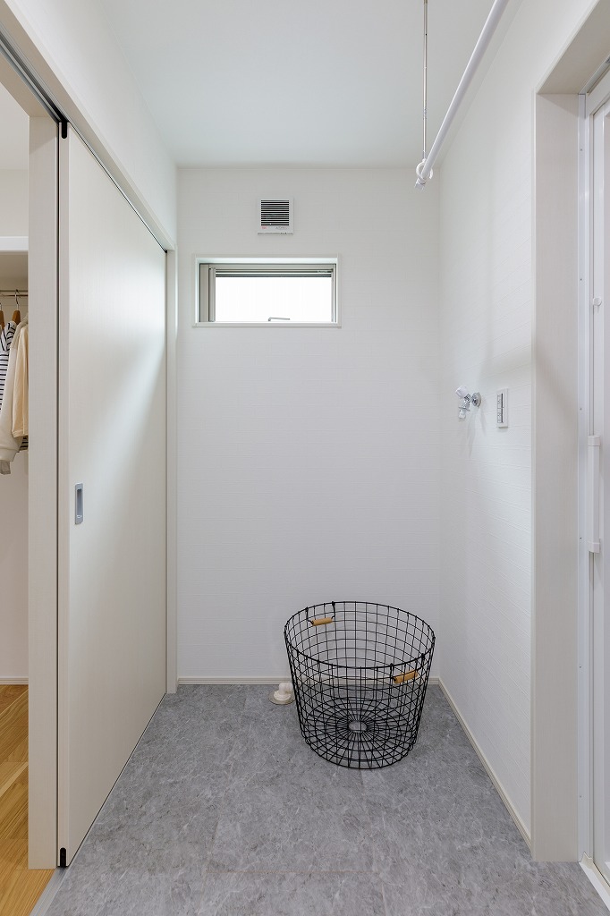 ランドリールームで室内干しをしたら、隣のファミリークローゼットにサッと収納できる。
