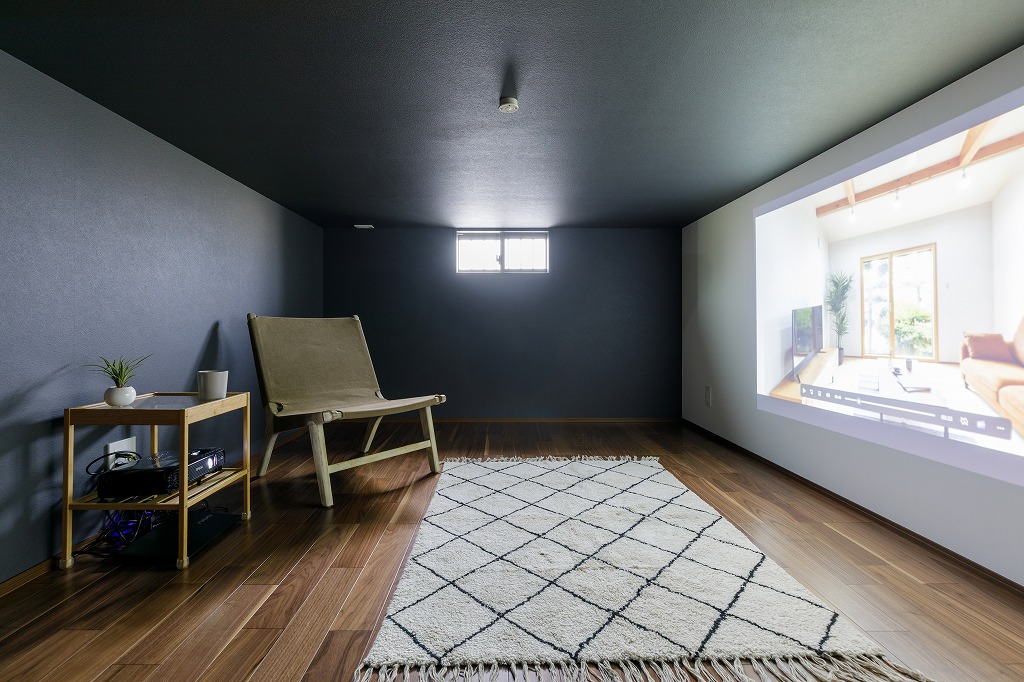屋根裏といえば収納スペースというイメージを持つ方も多いですが、このお宅ではその屋根裏を有効活用し、まるで秘密基地のようなプライベート空間を100インチ相当の大画面のシアタールームとして実現しました。