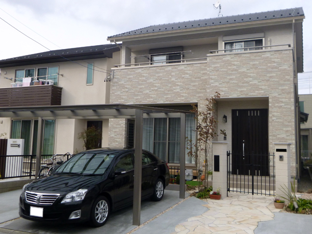 外壁は約70種類の中から奥様に選んでいただいた、とても上品なベージュの石柄。南欧風にまとまりました。