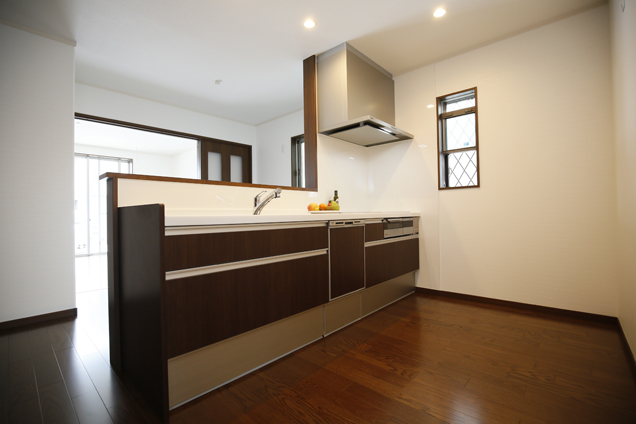 9帖のリビング。”ミディアム・ウォールナット”という2番目にダークなフローリングにして、とても落ち着いたシックな雰囲気にまとまりました。