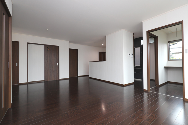 フローリングは濃茶の”ディープウォールナット”。建具も同系色にしてシックにまとめました。